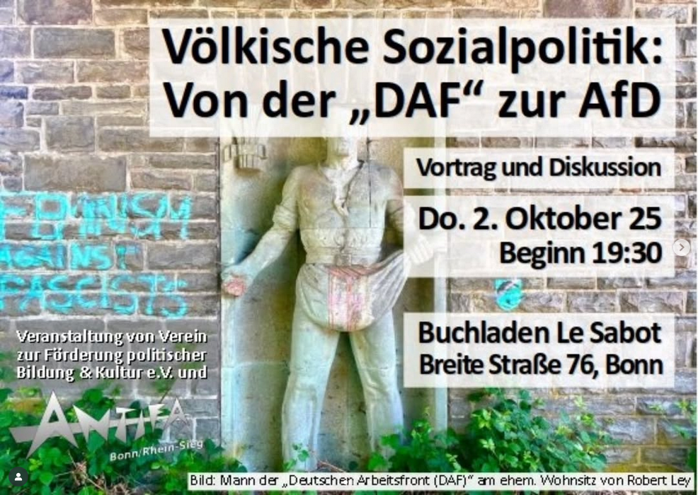 Veranstaltet vom Verein zur Förderung politischer Bildung & Kultur e.V., vom AK für Kultur & Politik an der Uni Bonn und der Antifa Bonn/Rhein-Sieg (https://antifabonn.noblogs.org/).