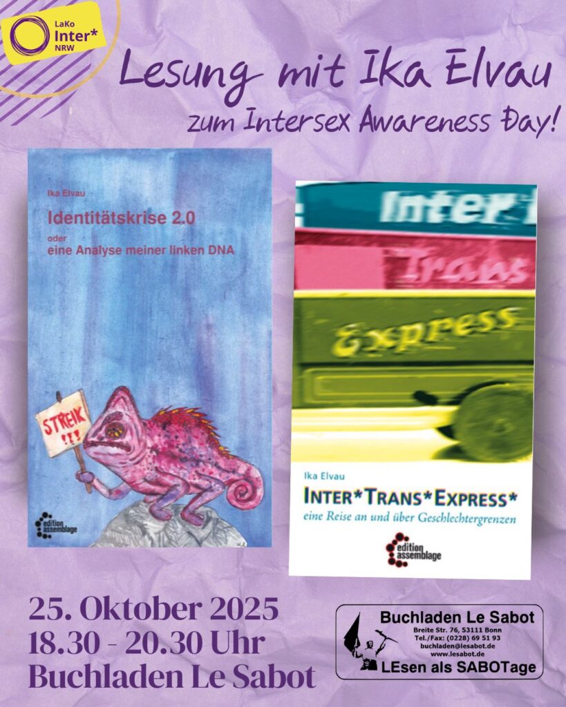 Anlässlich des Intersex Awareness Day (26. Oktober 2025) lädt der Buchladen Le Sabot in Bonn am 25. Oktober 2025 zu einer besonderen Lesung mit Ika Elvau ein.